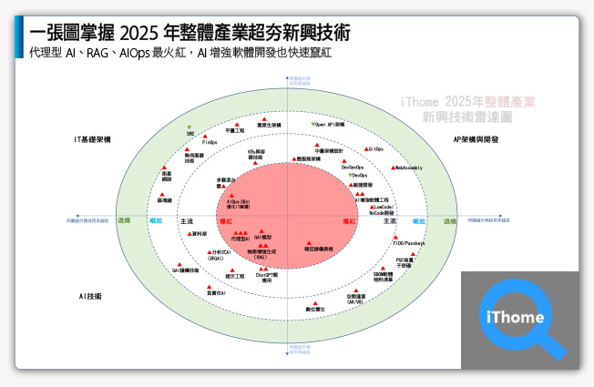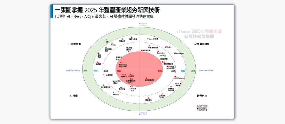 今年的爆紅技術包括了代理型AI、GAI模型、RAG架構、碳足跡儀表板、AIOps,這都是比去年採用率排名,大幅增加超過5名的熱門技術。K8s容器技術和多雲混合雲架構依舊是IT基礎架構的主流,AI增強軟體工程也成了今年AP架構與開發類的主流。