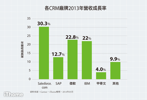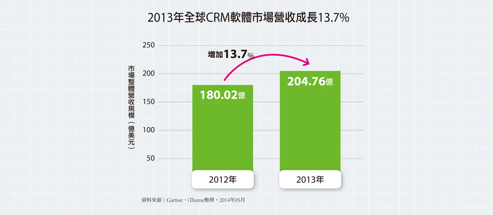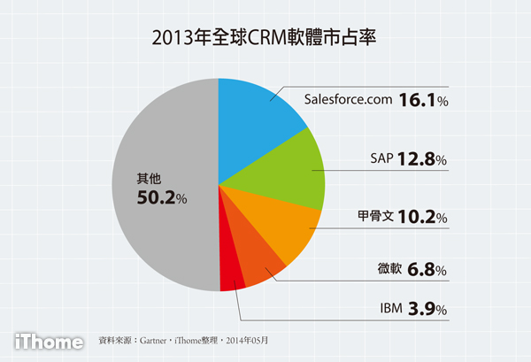 據Gartner 2013年全球客戶關係管理(Customer Relationship Management,CRM)軟體市占調查,2013年時,全球CRM軟體市場總營收為204億美元,比2012年總營收180億美元,成長了13.7%。
