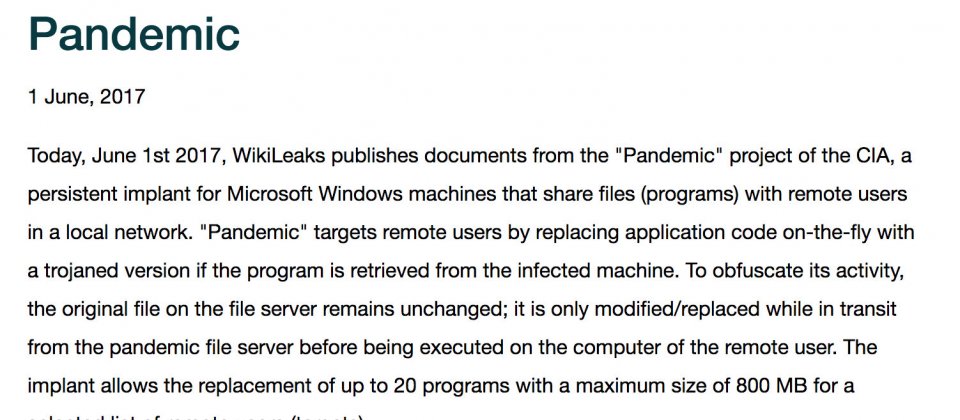 在這個名為Pandemic(時疫)的計畫,CIA開發了一個同名的可隱密潛藏在Windows檔案伺服器的植入程式。等它的目標使用者下載程式檔案時,就在過程中複製一個包含Pandemic的檔案分身供使用者下載。這個植入程式可置換多達20種程式,檔案最高達800MB。為了不曝露行動,它並未動到伺服器上的原始檔案,只有在下載時才會進行調包。