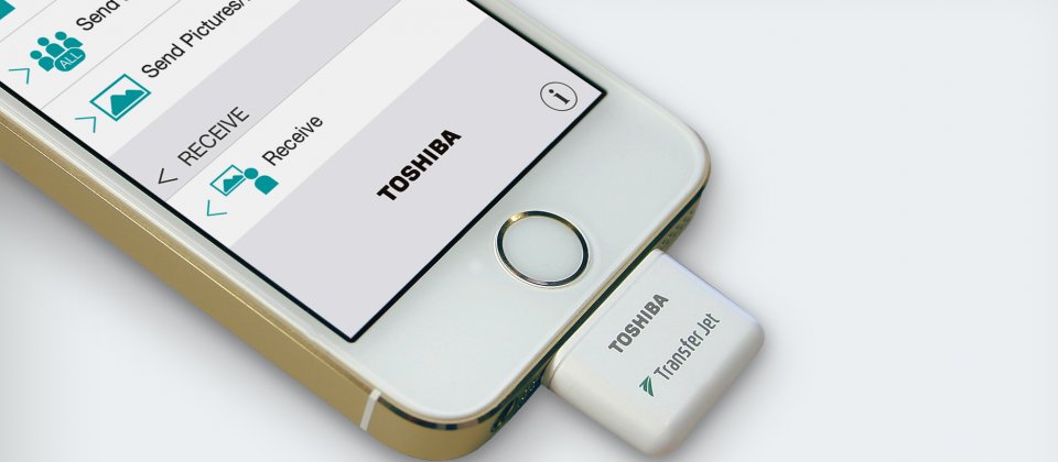 日本東芝(Toshiba)發表首款iPhone/iPad/iPod等iOS裝置專用的TransferJet無線傳輸器TJM35420LT,約3秒可傳完片長1分鐘、容量128MB的高畫質影片檔,預定2015年春季上市,售價約5000日圓。