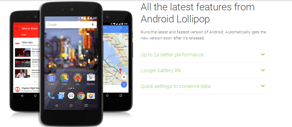 Google在Android官方網站上發布,月底將在印尼發行3款平價Android One手機 Evercross One X、Mito Impact和 Nexian Journey,三款都會預載最新系統Android5.1。機型內部均採用相同配置,4.5吋480 x 854解析度螢幕(FWVGA)、1.3GHz 四核處理器、1GB RAM和 8GB儲存(支援最高 32GB microSD 儲存),手機會有500萬和200萬像素鏡頭、1,700mAh 容量電池和雙SIM卡插槽。