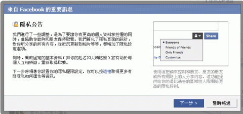 Facebook於近日開始針對全球3.5億的用戶部署新的隱私權功能,使用者在登入Facebook後會跳出一個要求重新設定隱私的視窗。新版隱私設定除了簡化設計網頁外,也提供可管理所有使用者所建立內容的工具。