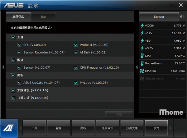 華碩BM1AE內建華碩工具軟體AI Suite II,其中集合多款工具,可以監控電腦的電壓、溫度、風扇轉速,也可以監控CPU頻率、更新主機板BIOS。
