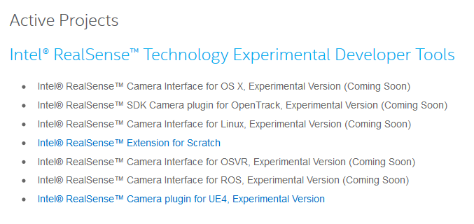 其他還有像是機器人作業系統(Robot Operating System,ROS),將能支援各種Intel RealSense技術功能,該介面能存取攝影機的景深資料;以及支援OSVR開發者平臺與多款頭戴式螢幕。