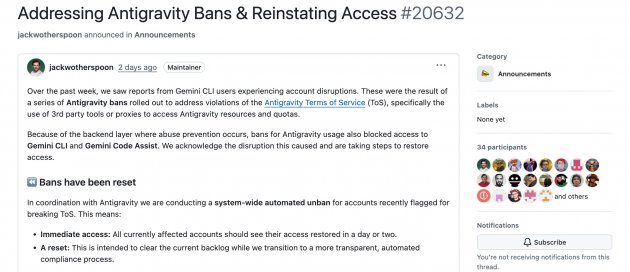 Google的AI代理人開發平臺Antigravity封鎖代理工具借用Gemini CLI的OAuth驗證等違規行為,連帶導致Gemini CLI與Gemini Code Assist存取中斷,目前已啟動系統自動解封,並引入在認證解封流程