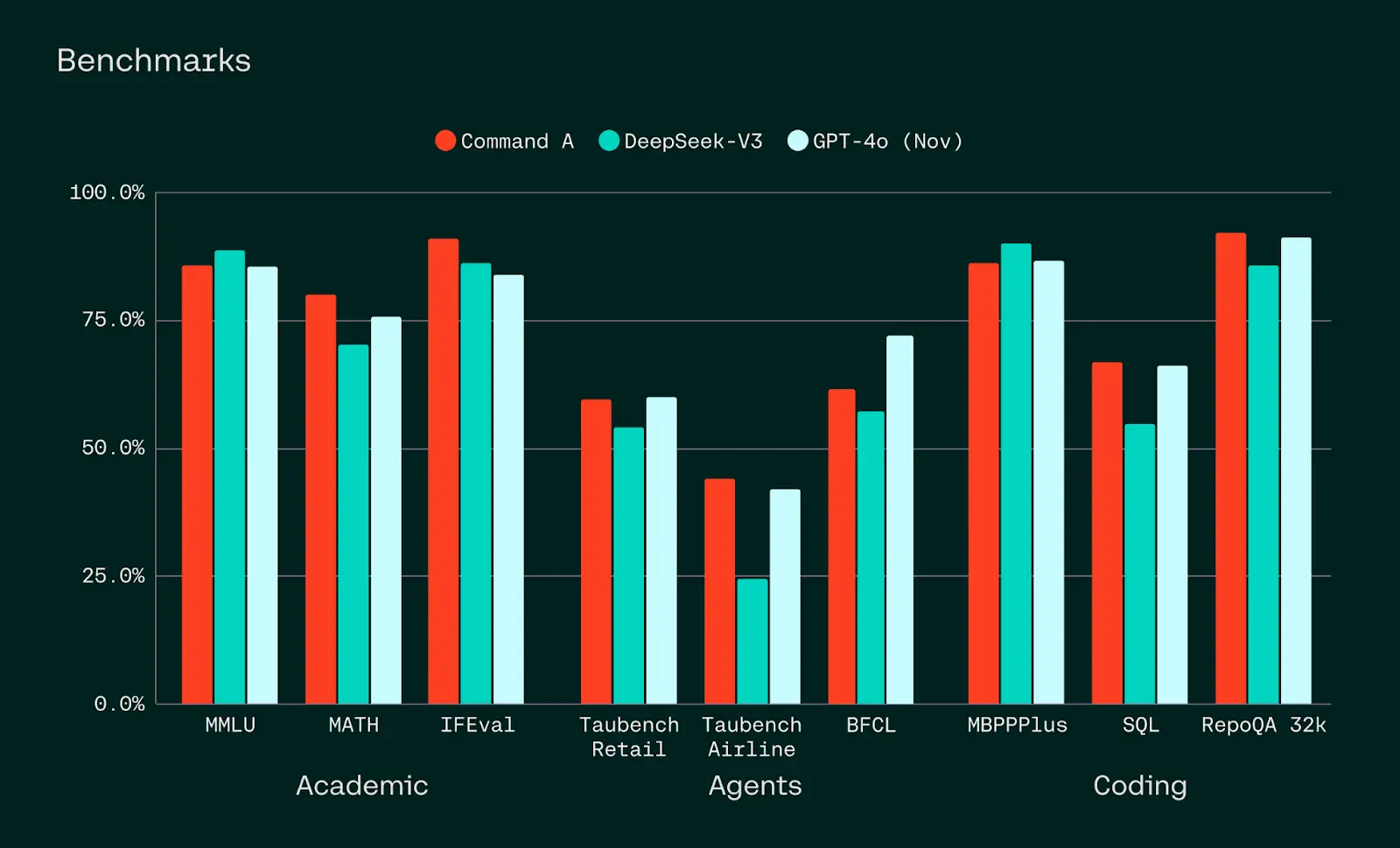 另一方面,在效能測試中,Command A最快每秒可輸出156個Token,比GPT-4o快1.75倍,比DeepSeek-V3快2.4倍,除了硬體優勢及輸出速度外,Command A在指令追蹤、SQL、代理程式及工具任務的基準測試中也有出色的表現。