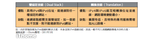 以雙協定方式而言,網路節點能同時擁有IPv4與IPv6的網路位址,讓使用者具有連線到2種協定網站能力。但缺點是,使用者需將各網路節點都更換成具雙協定的設備,如某一節點不具雙協定功能,則不能連線至IPv6網路。而轉換技術則能讓IPv4與IPv6的網路位址互相轉換格式,以此達到互相連線的目的。雖然它能夠不改變現有網路環境就能互連,但它有許多缺點。像擴展性太低,能轉換的服務也受到限制。如果要使用DNS、FTP這類應用,需要額外加裝ALG設備才能進行轉換。