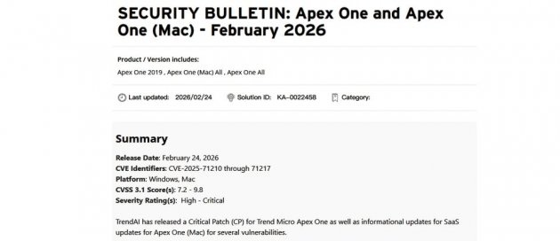 趨勢科技近日公布端點防護平臺Apex One的資安漏洞,並指出其中有兩個出現在管理主控臺的重大漏洞CVE-2025-71210、CVE-2025-71211相當危險,呼籲用戶應儘速採取行動因應