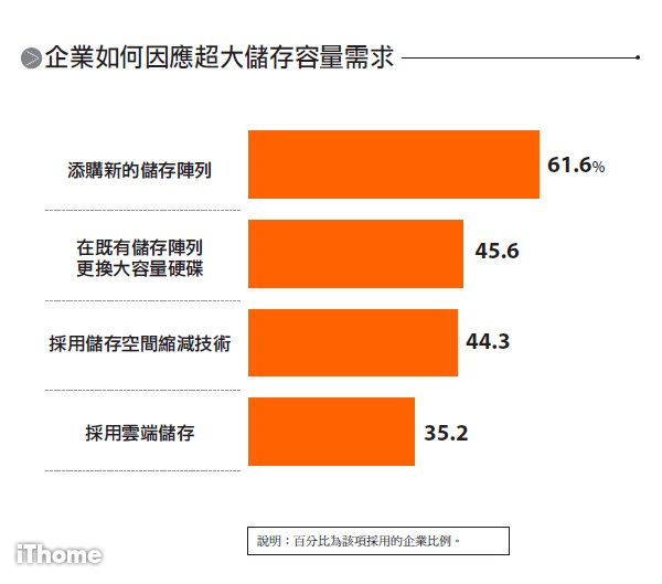事實上,我們這次的調查結果也顯示,當企業需要更大容量的空間時,除了建置新的儲存陣列、為儲存陣列換用更大容量硬碟等老辦法之外,使用低管理負擔的雲端儲存空間,已成為企業擴展儲存容量的主要選擇之一。