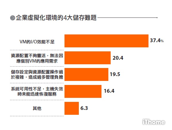 如同意料的,VM的I/O效能不足,是臺灣企業在虛擬化環境中最頭痛的儲存應用問題。