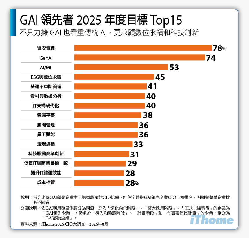 從iThome 2025 CIO大調查結果可以看到,想要善用生成式AI,GAI領先者除了更聚焦GAI優先策略之外,也會同時兼顧傳統分析AI,同時也比一般企業,更看重企業永續、員工賦能和用科技創新商業的態度。這是GAI領先者的年度目標,和落後者排名和比率差異最大的五項,也反映出領先者戰略的不同之處。