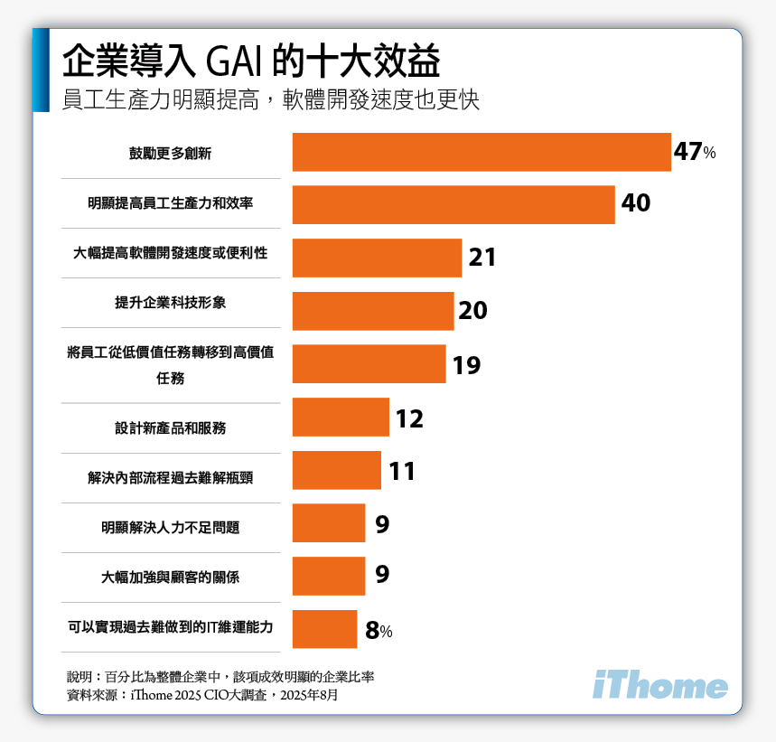 在今年大調查中,我們也調查企業實際導入生成式AI後獲得的效益,排名第一的是「鼓勵更多創新」,幾乎每兩家企業就有一家感受到GenAI這個效益。但是,創新只是讓企業可以嘗試更多的可能性,還不一定能夠獲得對營收或業績的實質幫助。