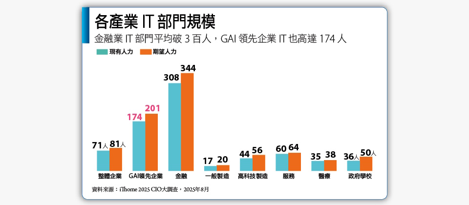 金融業IT規模最大,達到308人之多,GAI領先企業也多為大型企業,平均IT團隊規模也在174人之高。這個產業平均IT部門規模,可提供CIO規畫明年人力需求的業界參考,來向企業高層爭取更多IT人力的名額。