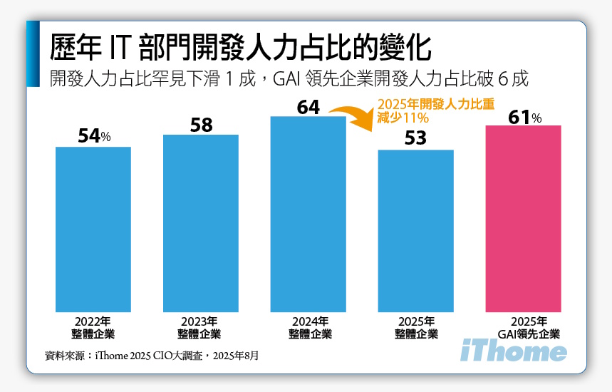 直得注意的是,開發人力在IT部門的比重,今年罕見下滑了11%,大約減少了快2成,從2022年開始,IT部門中的開發人力比重,從54%逐年提高,這也反映了開發戰力對IT應用的重要性,去年更達到64%之多。但是,今年大型企業的IT部門人力規模比去年更高,可是開發人力的比重卻明顯下滑。