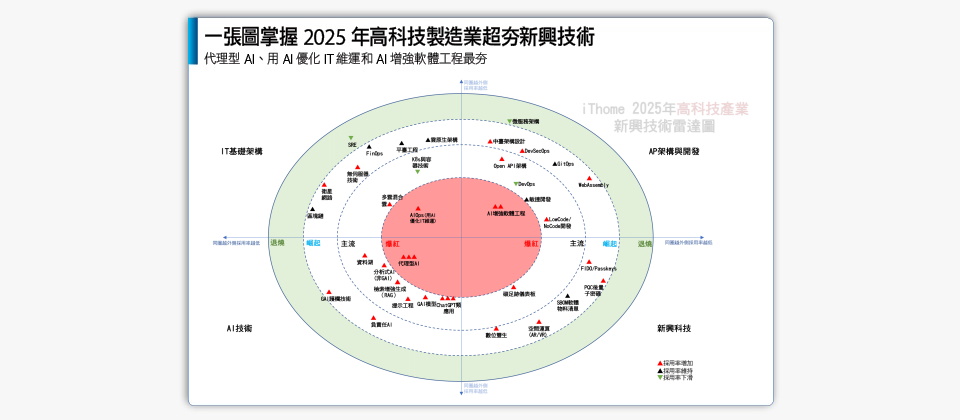 圖表說明 35項新興技術分為四類,包括了「IT基礎架構」、「AP架構與開發」、「AI技術」和「新興科技」,再按照2024與2025年的熱門程度變化,分為四個圈,每個圈中的技術代表不同的等級:爆紅技術(去年到今年的排名上升5名者)、主流技術(今年預估採用率超過平均採用率)、崛起技術(今年預估採用率低於平均採用率)和最外圈是退燒技術(今年比去年的排名下滑5名者)。同一圈中2025年預估採用率越高者,越靠近核心。紅色三角形代表企業採用率的增加幅度(超過10%者2個紅三角,超過15%者3個,後續每多5%,就多1個紅三角),綠色三角代表該項今年採用率減少者,減少5%者1個綠三角,超過5%者2個綠三角。兩年相比,採用率相同者,以黑色三角來代表。位於第四圈外者代表今年採用率降到0%。2025年高科技製造業技術平均採用率15.7%。