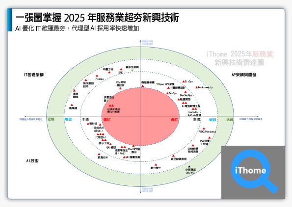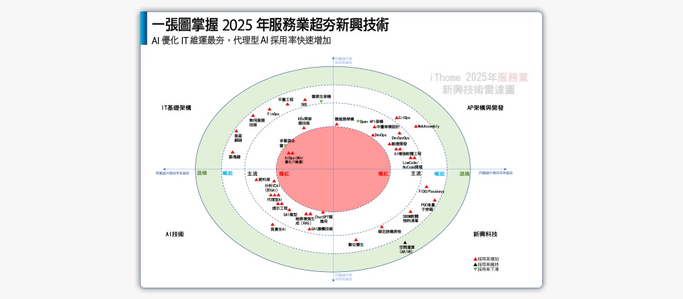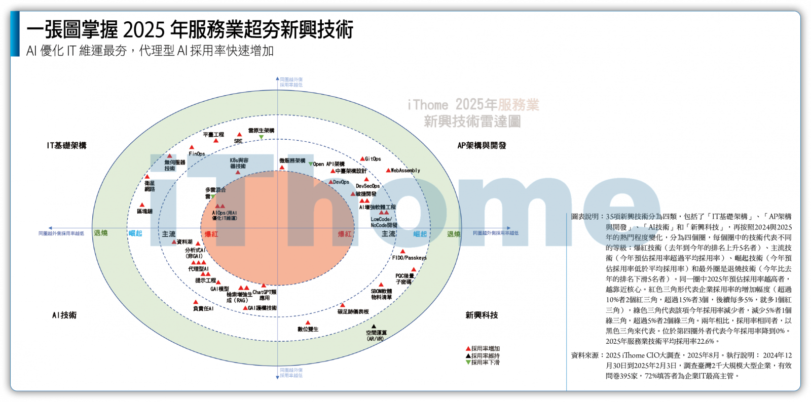 圖表說明 35項新興技術分為四類,包括了「IT基礎架構」、「AP架構與開發」、「AI技術」和「新興科技」,再按照2024與2025年的熱門程度變化,分為四個圈,每個圈中的技術代表不同的等級:爆紅技術(去年到今年的排名上升5名者)、主流技術(今年預估採用率超過平均採用率)、崛起技術(今年預估採用率低於平均採用率)和最外圈是退燒技術(今年比去年的排名下滑5名者)。同一圈中2025年預估採用率越高者,越靠近核心。紅色三角形代表企業採用率的增加幅度(超過10%者2個紅三角,超過15%者3個,後續每多5%,就多1個紅三角),綠色三角代表該項今年採用率減少者,減少5%者1個綠三角,超過5%者2個綠三角。兩年相比,採用率相同者,以黑色三角來代表。位於第四圈外者代表今年採用率降到0%。2025年服務業技術平均採用率22.6%。