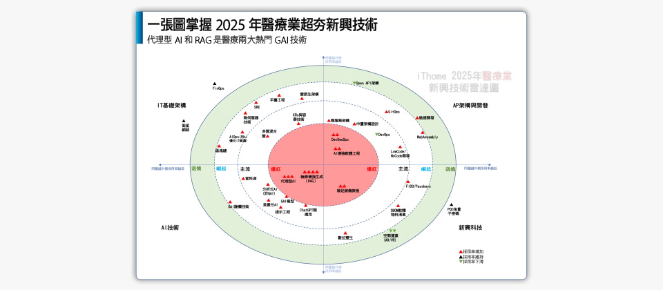 圖表說明 35項新興技術分為四類,包括了「IT基礎架構」、「AP架構與開發」、「AI技術」和「新興科技」,再按照2024與2025年的熱門程度變化,分為四個圈,每個圈中的技術代表不同的等級:爆紅技術(去年到今年的排名上升5名者)、主流技術(今年預估採用率超過平均採用率)、崛起技術(今年預估採用率低於平均採用率)和最外圈是退燒技術(今年比去年的排名下滑5名者)。同一圈中2025年預估採用率越高者,越靠近核心。紅色三角形代表企業採用率的增加幅度(超過10%者2個紅三角,超過15%者3個,後續每多5%,就多1個紅三角),綠色三角代表該項今年採用率減少者,減少5%者1個綠三角,超過5%者2個綠三角。兩年相比,採用率相同者,以黑色三角來代表。位於第四圈外者代表今年採用率降到0%。2025年醫療業技術平均採用率16.8%。
