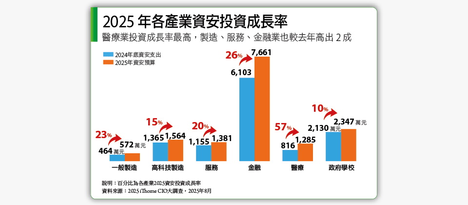 至於高科技製造業、政府與學校的資安投資成長,今年雖然不如其他產業,但與本身產業的前一年度相比,已有大幅提升的態勢。以高科技製造業而言,去年資安投資成長率僅2.4%,今年提升到15%,政府學校去年僅2.2%,今年提升到10%。