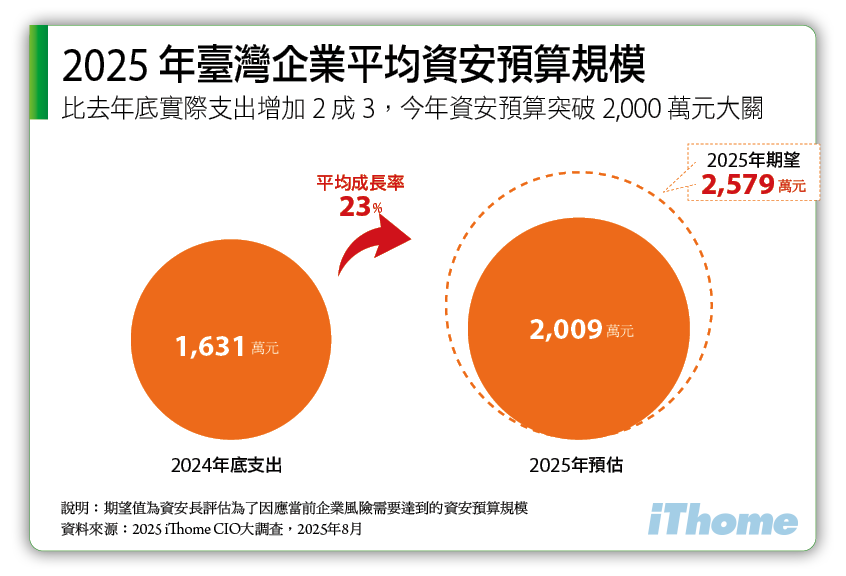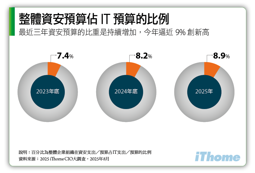 回顧兩年前政府推出《資訊服務採購作業指引》,規範新的資安要求,需將資訊經費中的5%作為資安經費,促進將資安預算獨立編列,並希望逐年提高資安預算比重到10%。如今2025年,不論民間與公家單位,在資安威脅態勢日益加劇下,顯然這些大型企業組織都將資安預算比重提升到1成以上,持續扭轉過往每年資安投資比例不足的狀況,至於未來是否能穩定攀升至10%至15%之間,值得持續關注。