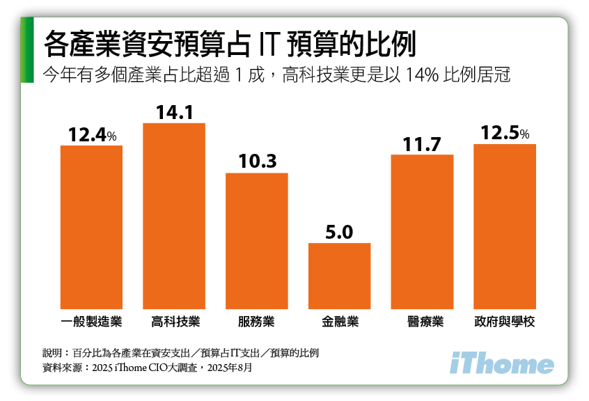 若從各產業來看,更是有5個產業的資安預算佔IT預算比例高於10%,高科技業(14.1%)居冠,政府與學校(12.5%)、一般製造業(12.4%)次之。