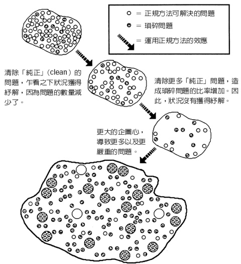 不僅如此,在一個系統內,正規方法最容易處理的問題,可以迅速被解決,但剩下來的瑣碎(messy)問題,則無法運用正規方法來解決。基於上述兩種效應,問題的本質已然有所改變,如圖1-2所示。
