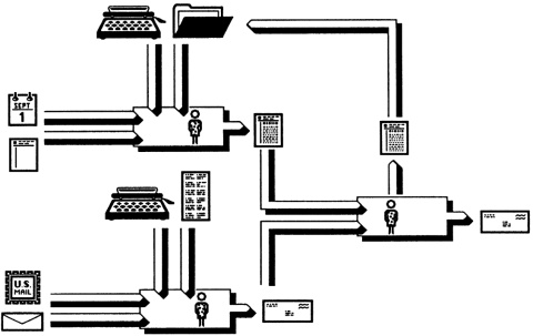 2. 由於每一種圖表各有優缺點,最好每一個工作人員都有繪製數種圖表的能力。為了達成這個目的,可以要求工作人員將某圖表轉繪為另一種圖表。圖1-3轉繪為圖1-4之時,轉繪者可能認為,打信件和打信封使用同一部打字機。這個假設值得討論,並引發如何準備信紙和信封的假設的討論。