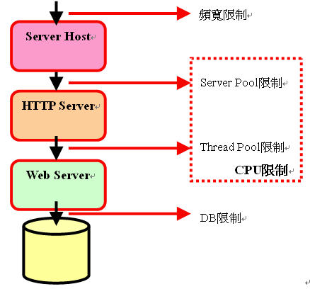 了解伺服HTTP請求的整個執行路徑之後,便可以藉此討論可能的瓶頸。可能的幾個限制包括:頻寬限制、Server Pool限制、Thread Pool限制及資料庫限制。