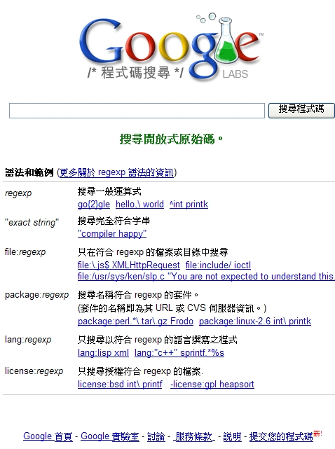 | Google提供了一個開放源碼的搜尋服務──Google Code Search,提供強大的搜尋機制,幫助程式人輕鬆搜尋散落於網路世界各處的開放源碼。 |