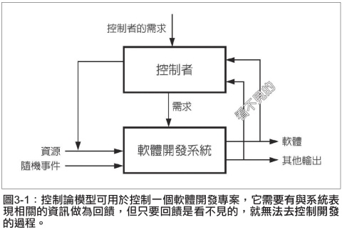 然而,從更底層來看,製造業的管理和專案管理兩者都用到控制論模型。我們將此模型重複放在圖3-1,但加了一樣東西:從「軟體」和「其他輸出」多出來兩條回饋線路,蓋上「看不見的」印章,其中一個原因是因為軟體天生就是看不見的,除非我們設法讓它看得見。