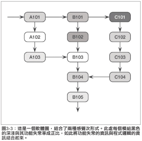 一般而言,每個人對資訊的呈現和接受都有其獨特的偏好。這樣的獨特性有些是植根於感覺主形式的偏好,有些則植根於個人經驗或目的上的差異。例如,程式設計師可能看邏輯性的圖(諸如流程圖)比較順,而經理人員可能偏好含有評量值的圖表。圖3-2中有關功能失常率的資訊如果能以圖3-3的形式來呈現,可能比較容易為程式設計師所接受,圖3-3是這個系統的流程圖,陰影的深度與每個模組的功能失常率成正比。這樣的圖表比單單使用流程圖或直方圖可提供程式設計師與經理人員間更好的溝通媒介。