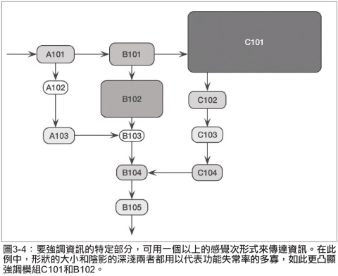 圖3-4除了陰影的深淺外,還利用形狀的大小來強化傳達的資訊。大小和深淺都是視覺形式中的次形式(submodalities)。利用愈多的次形式來承載相同的資訊,所傳達的訊息就愈強烈。圖3-4的訊息會讓經理人看到之後難以忽視。