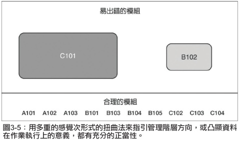 將資料像這樣的扭曲法在科學上是禁止使用的,但是在管理上就有充分的理由可以使用。專案經理在研究功能失常的資料時不會有那麼多的時間去完全符合科學的要求。他們為了能控制軟體開發過程,他們的反應必須隨著資料的意義做調整,如此方能獲致專案的成功。為達此目的,即使更加扭曲的資訊也是合理的,正如圖3-5所示,圖中所說的意思其實是,「此刻,除了C101和B102之外,其他的模組都不用管。把你擅長偵錯的高手用來對付C101,第二高手對付B102,以找出它們為什麼會成為易於出錯的模組,並重新設計這兩個模組,愈快愈好。」