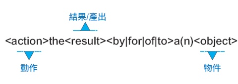 文句中所指的物件,就是前面提到的時間片段、角色、人(組織)地物、敘述這幾種物件。Peter Coad在書中舉了一個套用這個句型的例子——計算銷售總和(calculate the total of a sale)。
