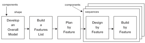 簡單的開發程序,不僅可以讓團隊成員專注在產出上,而非繁雜的執行步驟上,同時也讓新進的團隊成員可以迅速融入專案。因此,特徵驅動開發只有簡單的五個步驟。請看圖 2,這是Peter Coad書上的圖,我重新繪製的。
