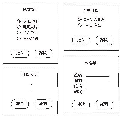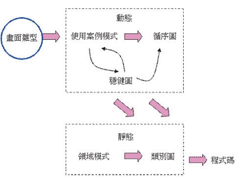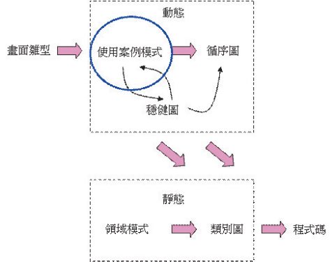 仔細看到ICONIX方法中,在建構使用案例模式之前,可以先構思畫面雛型(GUI prototype),並且由此獲得有用的資訊,有助於繪製使用案例圖及撰寫使用案例敘述,如圖5所示。