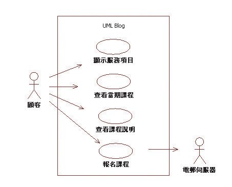 所謂的使用案例模式,主要包含了使用案例圖(use case diagram)和使用案例敘述(use case narrative)。