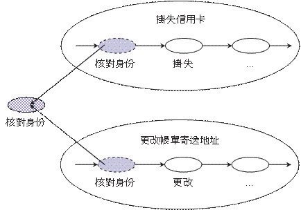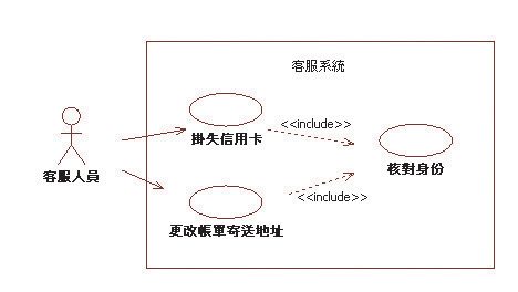 透過包含關係,使用案例可以將其它使用案例內部的流程包含進來成為自己的流程。舉例來說,如果我們打電話向銀行的客服人員提出掛失信用卡的申請時,客服人員都會先核對來電者的身分。還有,如果我們去電要求更改帳單寄送地址時,客服人員也會先核對來電者身分,如圖8所示。