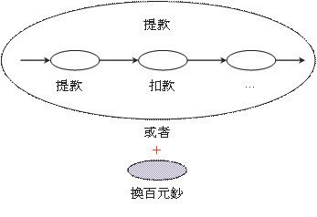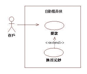 由於,換百元鈔不是獨立的服務,它僅是提款流程中的一個擴充選項,所以我們可以使用擴充關係來表達這樣的設計,如圖11所示。
