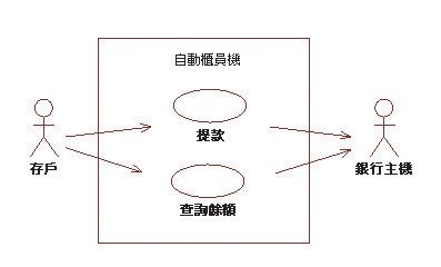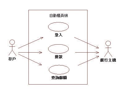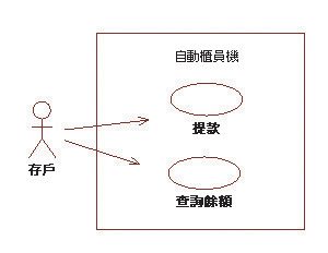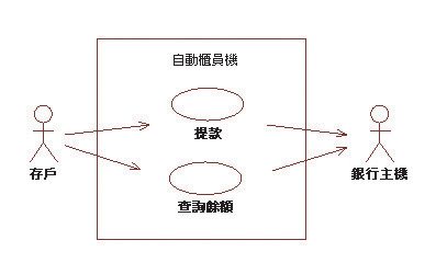 舉例來說,存戶是自動櫃員機的使用者,若是單純以存戶的角度來繪製使用案例圖的話,可能會得到如圖13。