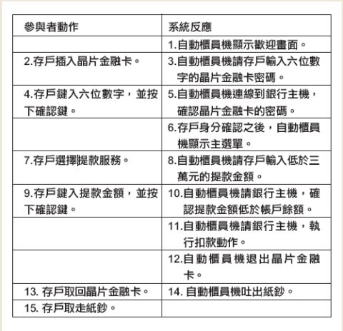 以自動櫃員機的提款使用案例敘述為例,兩欄式的寫法如表16。