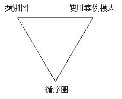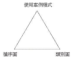 雖然,原著的章節安排是先談到模式領域的概念,接著才談到使用案例模式的概念,可是由交易樣式(transaction patterns)來看,ICONX方法似乎也可以先進行使用案例建模。實務上,先建構使用案例模式的正三角形法,如圖2所示。或者,使用案例模式與類別圖同時建構,如圖3的倒三角形法。這兩種方法皆可行,並沒有標準的作法。