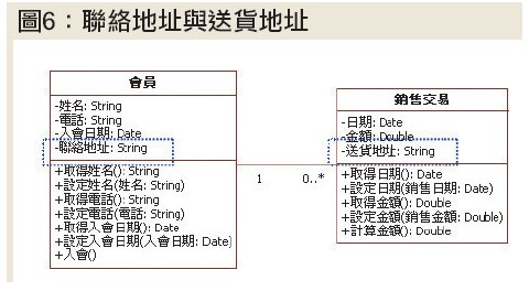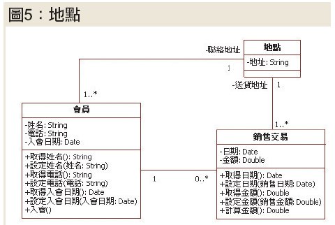 要是物件化過了頭,反而會出現許多細微的物件,讓系統更加複雜。所以,或許把圖5中的地點刪去,將它的屬性分別併到銷售交易和會員兩類別中,改成如圖6會更為恰當。