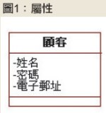 例如,在問題領域中的「顧客」具有姓名、密碼、地址、身高、體重、年齡、興趣、電話、身分證字號、電子郵址等等,可是對於線上購物系統而言,僅僅需要記得顧客的姓名、密碼和電子郵址即可,如圖1所示。所以,系統分析師得問自己「哪些資訊需要物件長期記得的?」這個問題,學會過濾一些多餘的資訊。