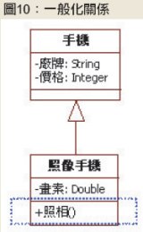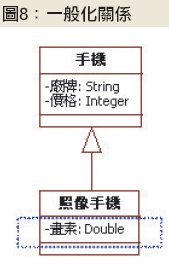 遇到這種情況的時候,系統分析師可以考慮使用一般化關係,將所有手機相同的屬性放到父類別中,然後新增一個名為「照相手機」的子類別,再把跟照相手機有關的「畫素」屬性放進來,如圖8所示。