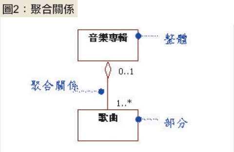 以音樂專輯為例,當某一個音樂專輯不存在時,收錄在音樂專輯中的歌曲並不會因此而消失,甚至某一首歌曲,可以重複收錄在多個不同音樂專輯中。這樣的情況,就適合使用聚合關係,如圖2所示。