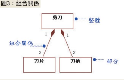 再看到圖3的例子,剪刀主要是由兩個刀片和兩個刀柄所組成的,一旦這把剪刀報廢掉了,組成它的刀片和刀柄也將一併報廢掉,所以這個範例適合使用組合關係。