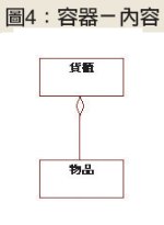 前面提到的圖3中,剪刀與刀片、刀柄之間的關係,屬於此處的集合-成員關係。還有,容器-內容的情況也很常見,像是貨櫃和物品之間的關係,就是容器-內容,如圖4所示。