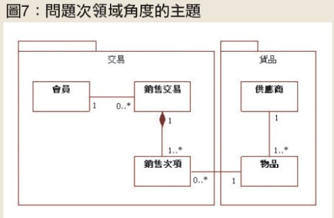 而且,最好採用「問題次領域」(problem sub-domains)做為主題範圍,這樣的主題會比傳統使用功能分解的角度要好多了。問題領域大約可以細分成4個到5個問題次領域,而且每一個問題次領域中,約略可以包含50到100個類別。