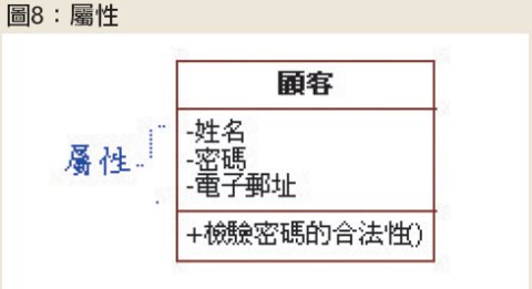 物件需要保存的資料,記錄在類別中的屬性格中。以線上購物系統為例,系統必須負責保存顧客的姓名、密碼和電子郵址,因此顧客類別的屬性格中,便會列出這些需要保存的屬性,如圖8。