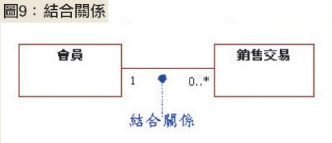 除了屬性之外,通常系統還需要保存物件之間的連結。在UML中,系統分析師可以使用「結合」(association)關係,來表達兩物件之間的連結。以線上購物系統為例,系統必須負責保存會員與銷售交易之間的連結,所以會員與銷售交易兩類別之間會有結合關係,如圖9所示。
